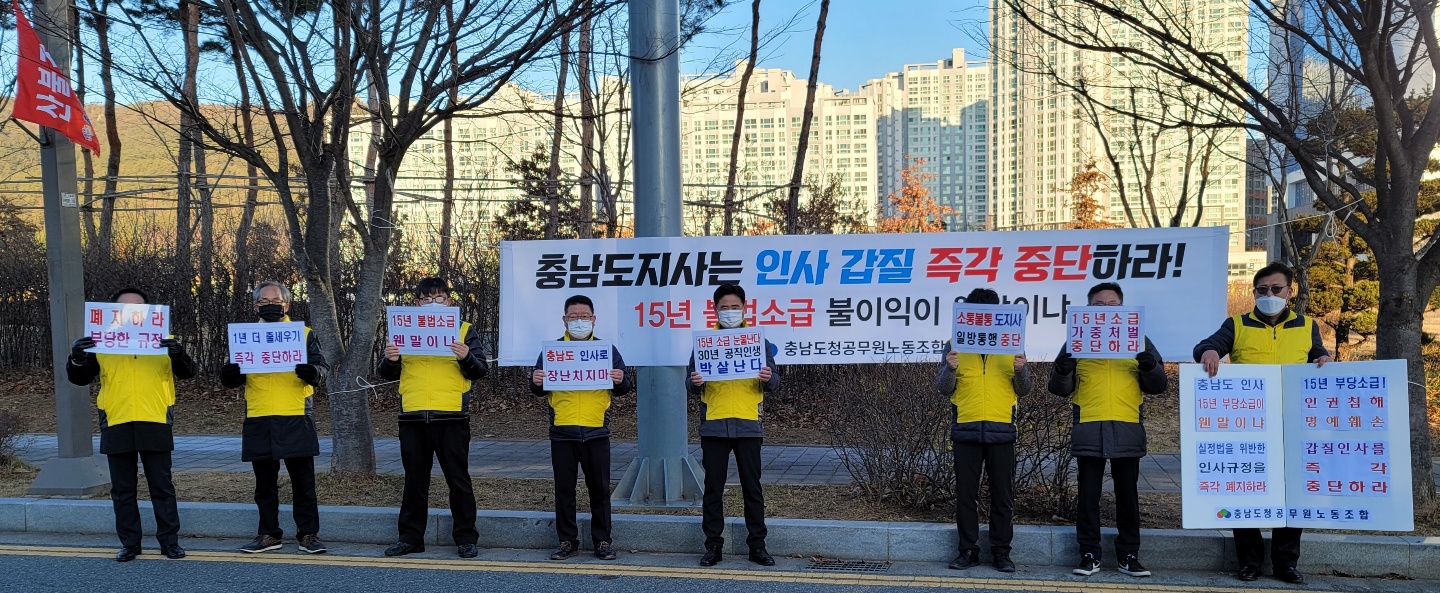 양승조 지사 인사 재량권 남용에 맞서 장외 집회 신고 마쳐 충남도청공무원노조 "양승조 지사 인사재량권 남용" 강한 비판 충남도청공무원노조 "양승조 충남지사 인사재량권 남용" 충남도청노조, 도 인사권 남용 등 장외투쟁 선포! 인사재량권을 남용한 도지사에 대한 장외투쟁 선포 (속보) 충남도청공무원노동조합, 양승조지...